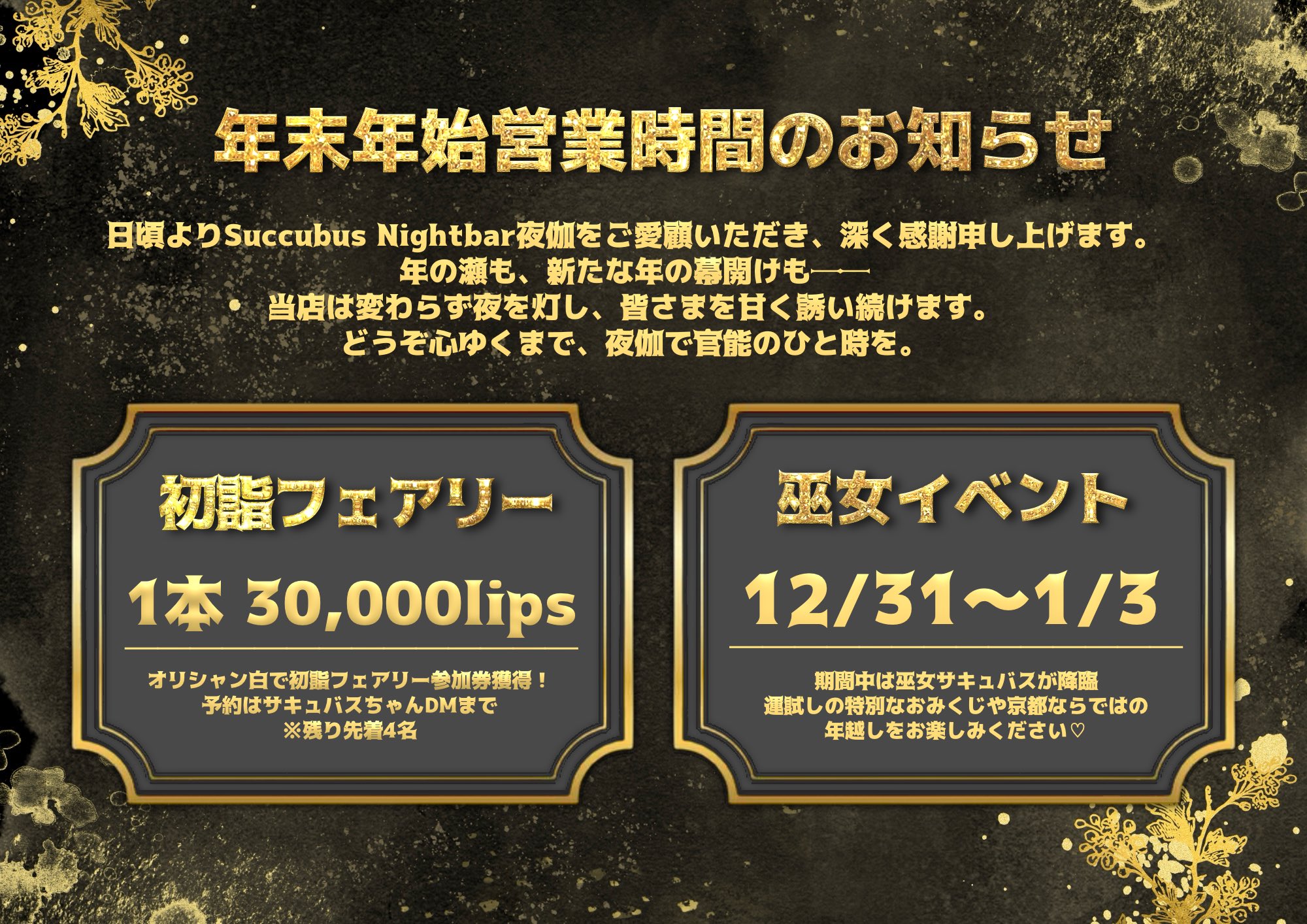 🎍年末年始営業時間のお知らせ🎍 日頃より Succubus Nightbar 夜伽 をご愛顧いただき、深く感謝申し上げます。 年の瀬も、新たな年の幕開けも—— 夜伽は変わらず夜を灯し、皆さまを甘く誘い続けます。 どうぞ心 […]