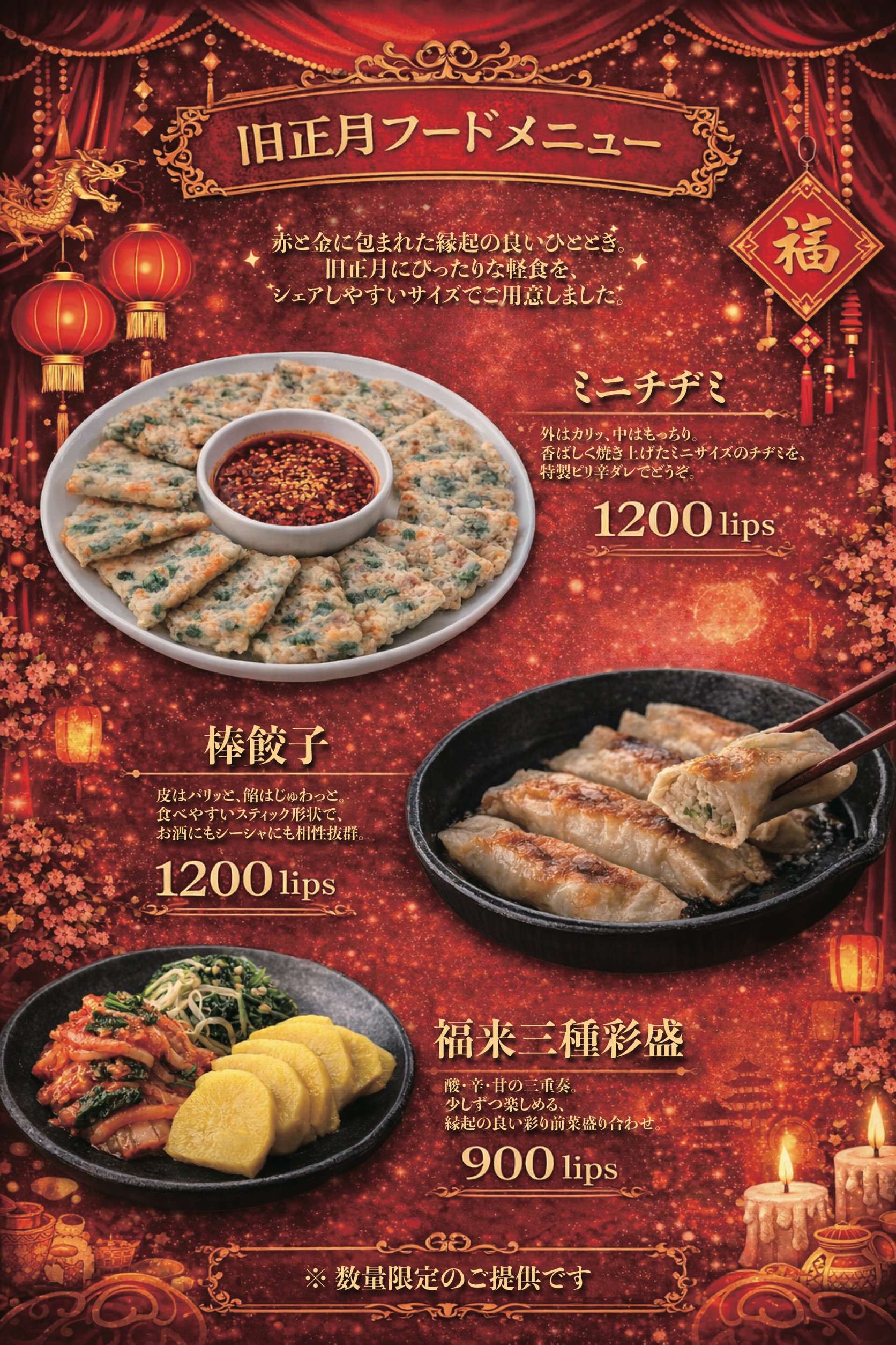 🏮 旧正月フードイベント 🏮 🗓️ 1月30日(金)〜31日(土) 赤と金に包まれた、縁起の良いひととき。 旧正月にぴったりな軽食を、 シェアしやすいサイズでご用意しました。 ミニチヂミ 1,200 Lips 外はカリッ […]