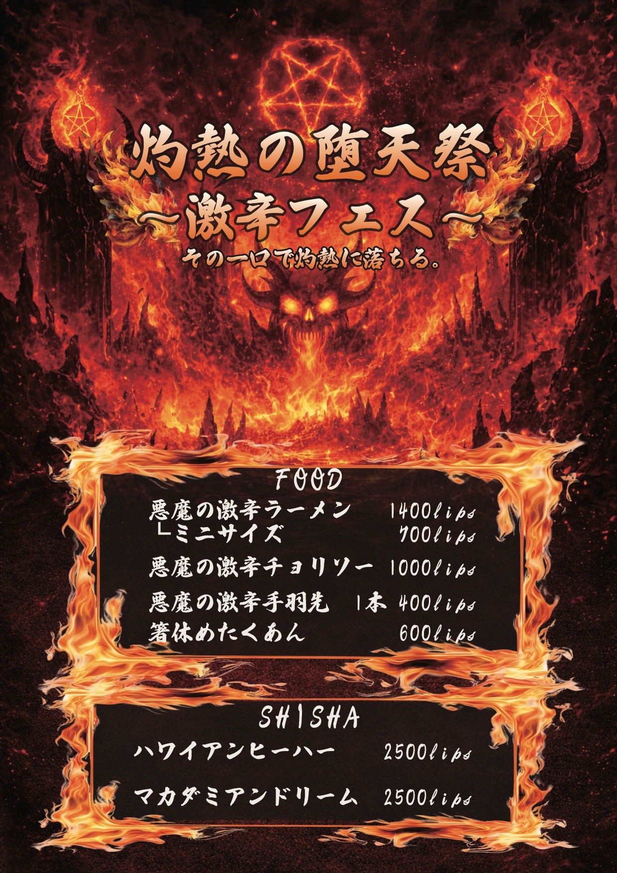 灼熱の堕天祭 〜激辛フェス〜 その一口で灼熱に落ちる FOOD 悪魔の激辛ラーメン ミニサイズ 700lips 1,400lips 悪魔の激辛チョリソー 1,000lips 悪魔の激辛手羽先 1本 400lips 箸休め […]