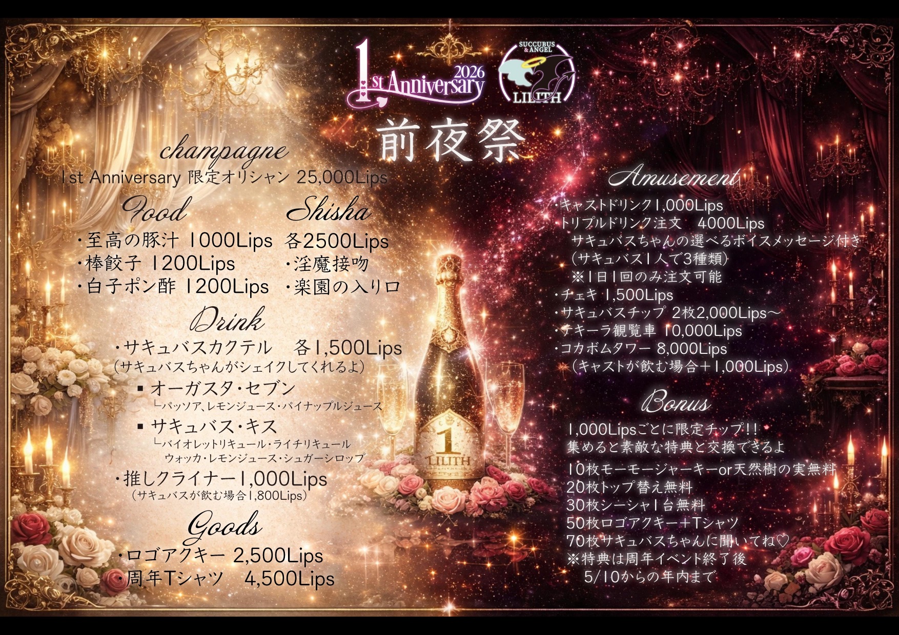 Succubus Shisha LILITH 1st Anniversary 2026 前夜祭 Champagne 1st Anniversary 限定オリシャン 25,000Lips Food 至高の豚汁 1,000L […]