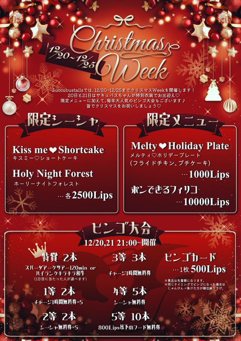 🗓️ 2025.12/20(sat) ~ 12/25(thu) Succubustailsでは、12/20~12/25までクリスマスWeekを開催します! 20日と21日はサキュバスちゃんが特別衣装でお出迎え♡ 限定メニ […]